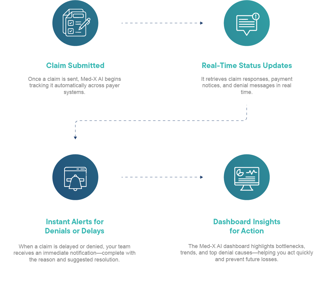 Med-X Al seamlessly integrates with your PMS and payer portals to track every claim automatically-from submission to adjudication. It identifies delays, alerts you to pending or denied claims, and even groups denials by cause so your team can act fast and get paid sooner.